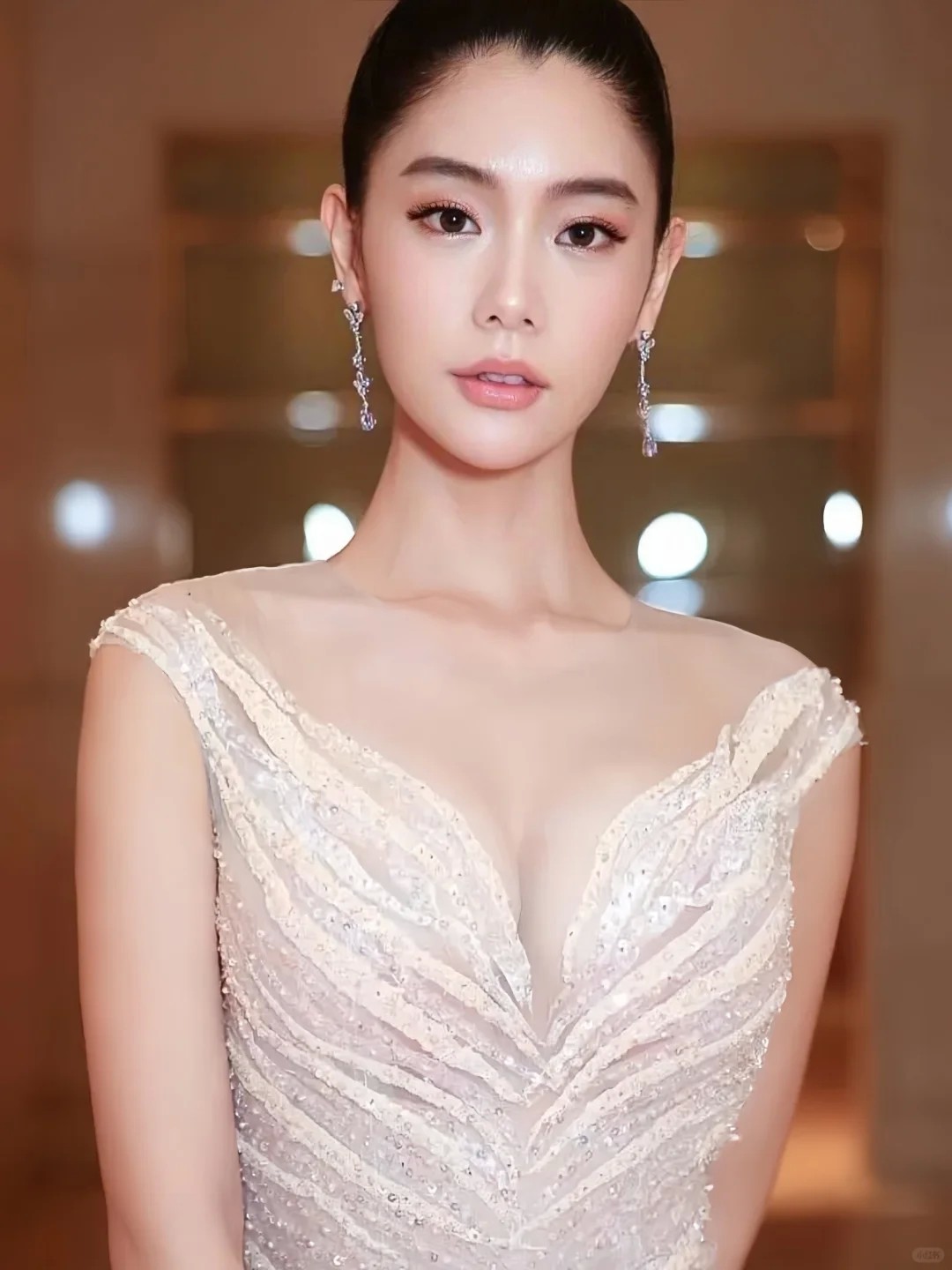 当然,克拉拉在时尚与经典造型上的表现力同样无可挑剔。她能完美驾驭诸如蓝黑色刺绣短旗袍这样的服饰,将其穿出既古典又时髦的风情。她也曾以一袭微透的蕾丝鱼尾裙亮相,完美的S型曲线在若隐若现的面料下展现得淋漓尽致,冷艳高贵,宛如人鱼公主。而一套简洁的白色深V西装长裙,又能让她瞬间切换成干练又性感的“财阀千金”风格,展现其可塑性与强大的气场。每一种造型,都是她作为演员和时尚偶像不同侧面的精彩表达。