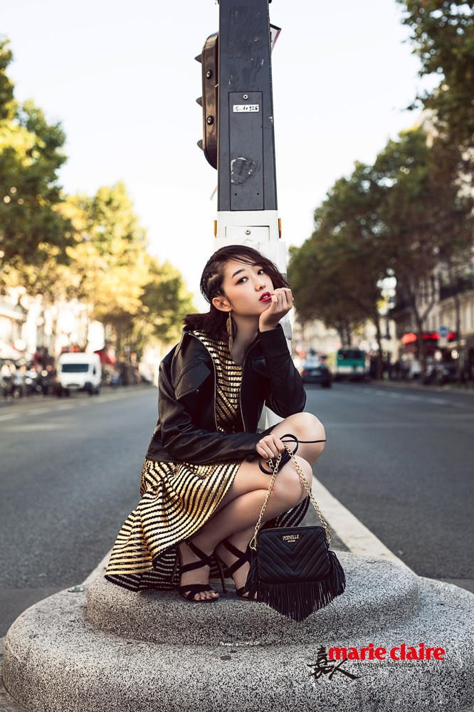 整组大片的基调建立在一种富有力量感的摩登美学之上。服装选择上摒弃了繁复的裙装,转而采用利落的机车皮衣、挺括的西装、简约的黑色背心等单品。这些充满现代感和叛逆精神的服装,与她此前那些飘逸的古装或华丽的礼服形成了鲜明对比。特别是皮革材质的光泽与质感,在镜头下被放大,强化了冷峻不羁的氛围。曾经的舞蹈学习经历,此刻赋予她的不再是柔美的肢体语言,而是对力量与线条的精准控制。她的姿态放松却充满张力,一个简单的倚靠或坐姿,都透露着随性洒脱的“公子”气度,这与她拍摄高定礼服时那种优雅妩媚的坐姿截然不同,展现了其极强的可塑性。